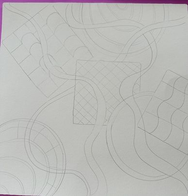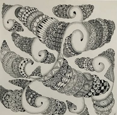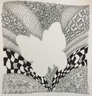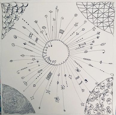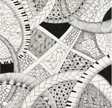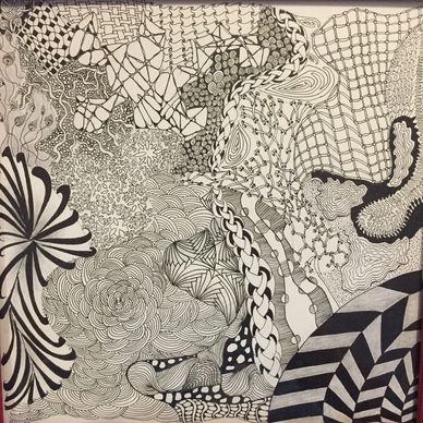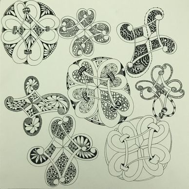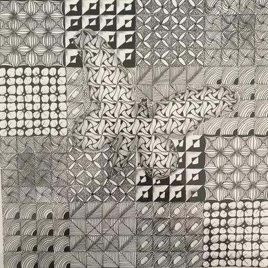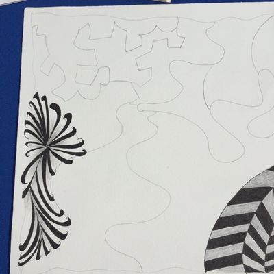 After drawing shapes as the string, we filled in the tangle patterns then drew tangle patterns in the background. - See next photo on how we started to connect them.