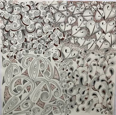 Heart cutouts were traced and tangled. Organic patterns drawn around the rest of the tile. TEA 3 hour class. Finished on own.