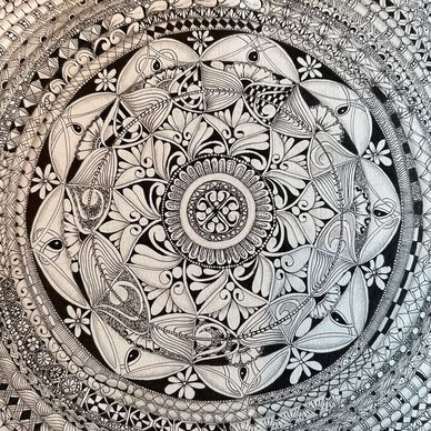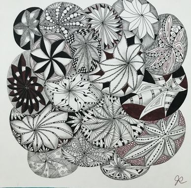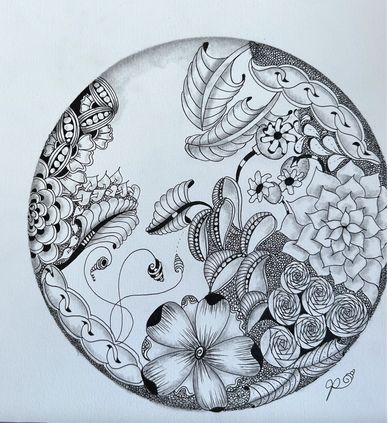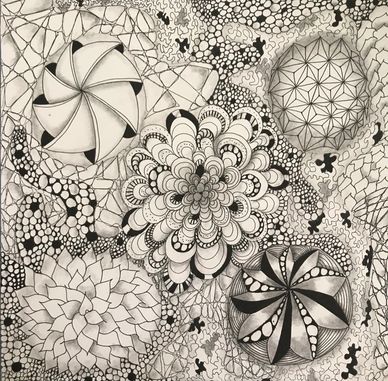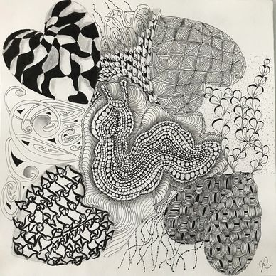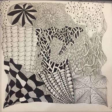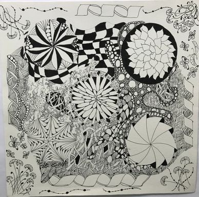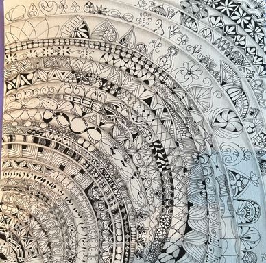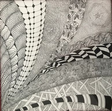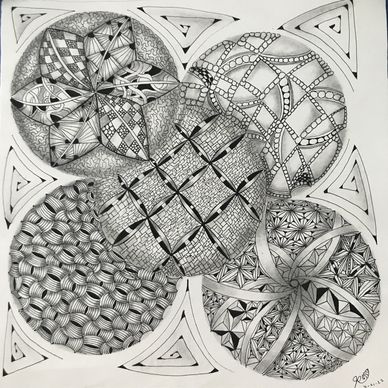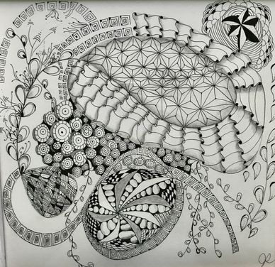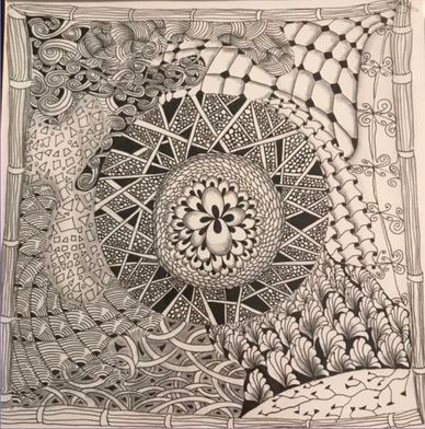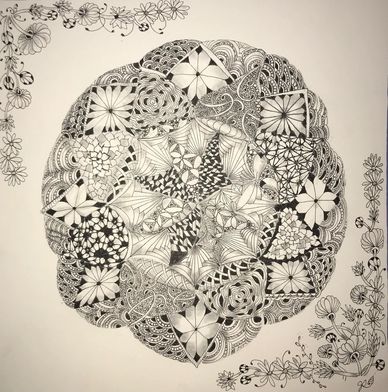 Class on Zoom for two weeks, twice per week for 90 minutes each. January 2022. Started with tracing a Zentangle Zendala Round Tile in the middle and worked off of that. See step-out on Jacki' Patterns page of this website.