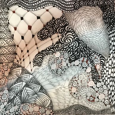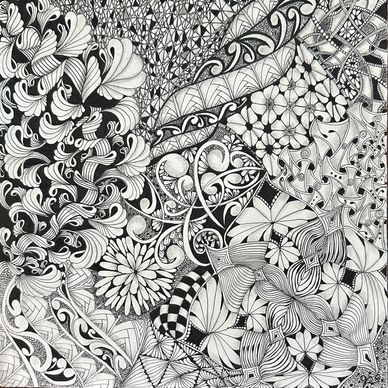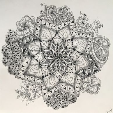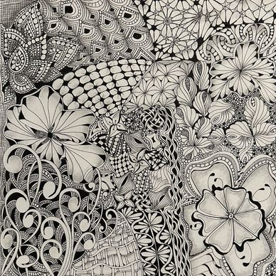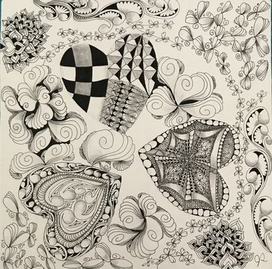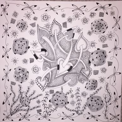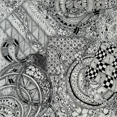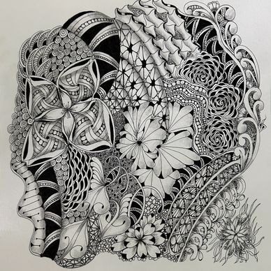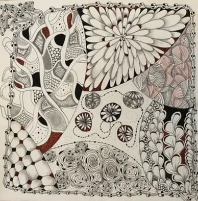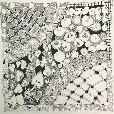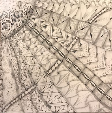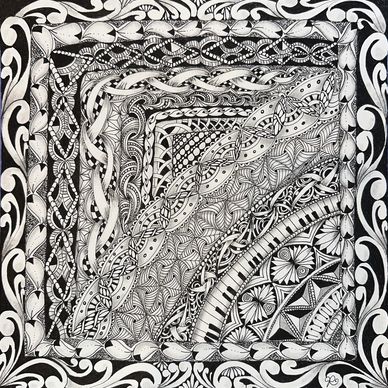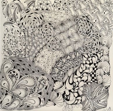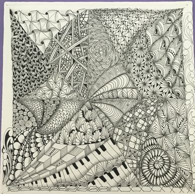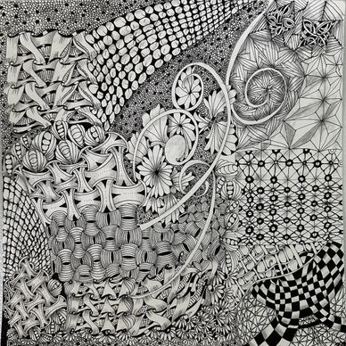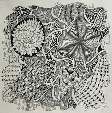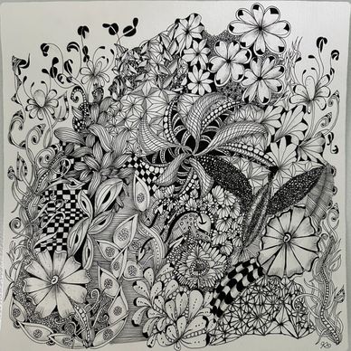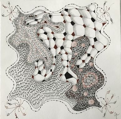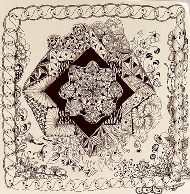 Tangled the backside of an Opus Tile with the intent to combine florals, vines, grids and more in an organic way. Still working on it. Will upload new photo when it is completed.