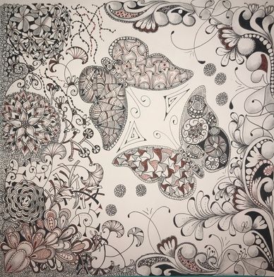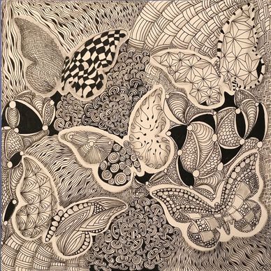 Everyone in class received a butterfly cutout to trace. The rest are all organic patterns moving along the perimeter of the tile and flowing towards the middle. We used the brown pen for accents. TEA 3/11/21 (3.5 hr class). Students finished on their own.