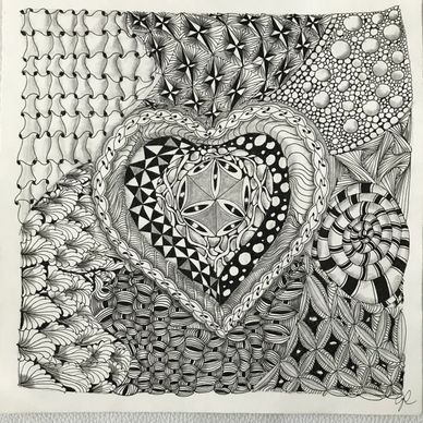 I did this one on my own in preparation for a class to teach. First I traced the heart in the middle, then drew the string around the heart. I chose patterns that I love to draw.