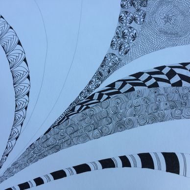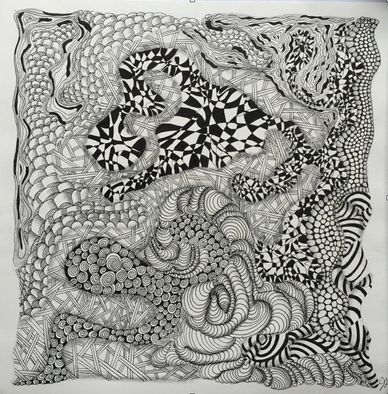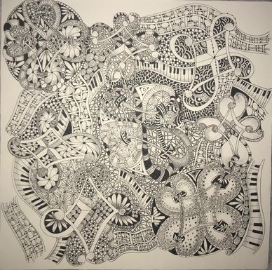 I chose to make all string sections curvy with patterns intertwining. I drew the string first of all sections, not knowing how many sections I would draw. Then started to draw each section, not having a plan, not knowing what tangle patterns I was going to draw. Did this while vacationing in Florida for a month and took about a month to complete. I left it out on the table and did a little bit whenever I felt like it.