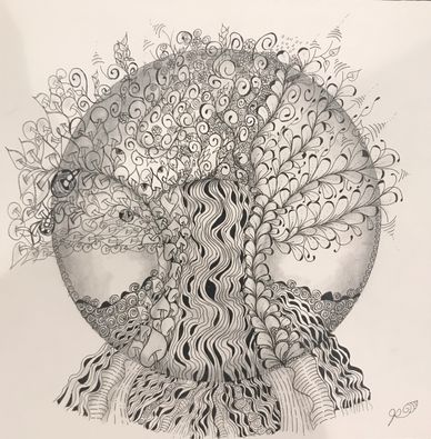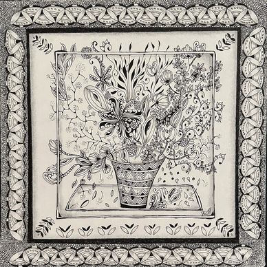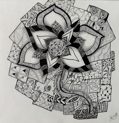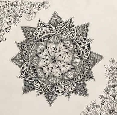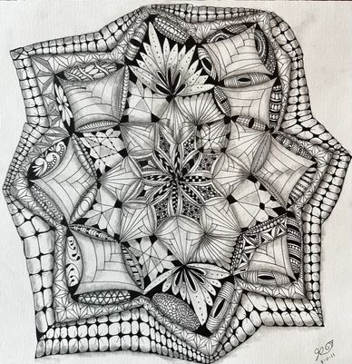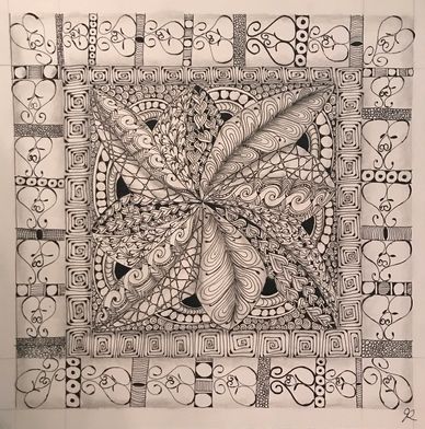 This is the tile I created in preparation for Zendala Opus Jan 2022. I decided to leave out closing up the Zendala Edges for the class, but liked it so much I submitted it for the Zentangle Display Wall at The Villages, FL.