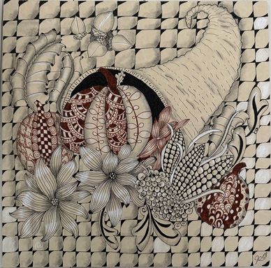 An all day Opus Class taught by 4 CZTs: Diane Jonas, Trish O'Leary, Chrissy Immordino and myself (Jacki Rose). I taught the border and decided to fill in the background with it on my own. See all of the different ones from class at: https://czttangle.com/fall-four-tangle-1